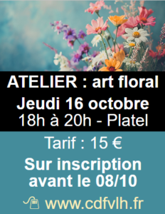 Prochain atelier Art Floral le 16 octobre, salle Platel (rugby) de 18h à 20h. Inscription avant le mercredi 8 octobre ! 15 euros (pour l’achat des fleurs) Pensez à amener votre matériel : ciseaux, fil de fer, cordes… Plus d’informations via le formulaire de contact.