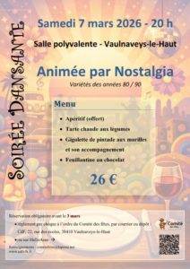Le groupe Nostalgia a mis une ambiance formidable et la piste de danse ne s’est presque jamais vidée. Une belle réussite ! Les participants sont repartis ravis de cette soirée, c’est donc mission accomplie pour nous, bénévoles ! Quelques photos de la soirée : Menu : apéritif, tarte chaude aux légumes, gigolette de pintade aux morilles et son accompagnement, feuillantine au chocolat. Réservation sur HelloASSO